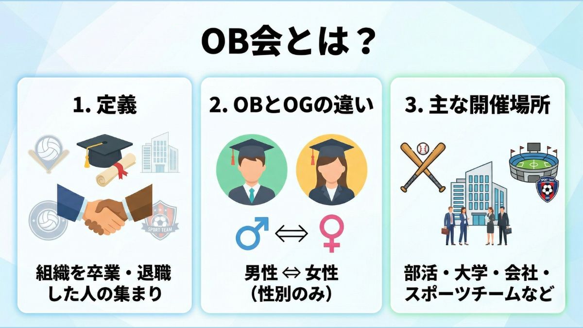 招待状やSNSで急に「OB会」という言葉を目にして、「で、結局なんなの?」と調べている人も多いはず。まずは基本を整理していきます。