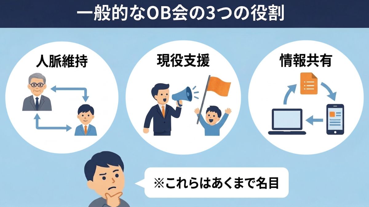 OB会の目的は「かつての仲間とのつながりを維持し、現役世代を支援すること」ですが、実際にその目的が果たされている会合は少ないのが現実です。