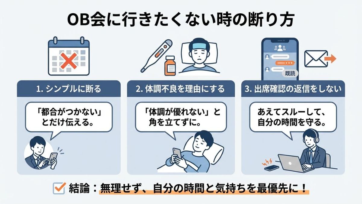 OB会に行きたくないときは、無理して参加せずシンプルに断るのが一番です。「めんどくさい」「無意味」って感じてるなら、その直感に従って問題ありません。